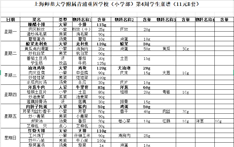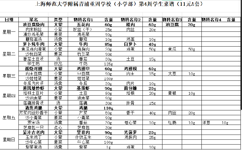 上海师范大学附属青浦重固学校(小学部)第4周学生菜谱