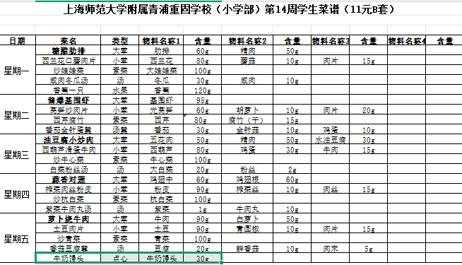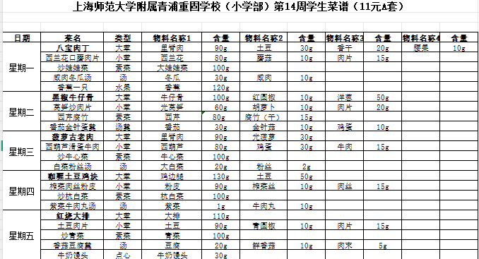 上海师范大学附属青浦重固学校(小学部)第11周学生菜谱