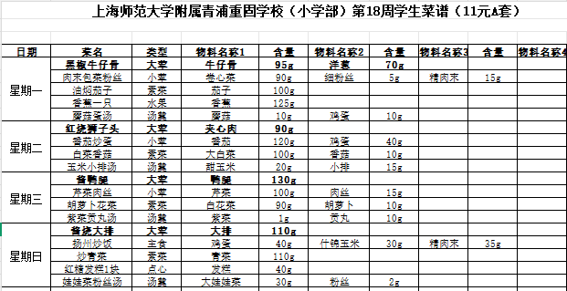 上海师范大学附属青浦重固学校(小学部)第18周学生菜谱