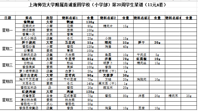上海师范大学附属青浦重固学校(小学部)第20周学生菜谱