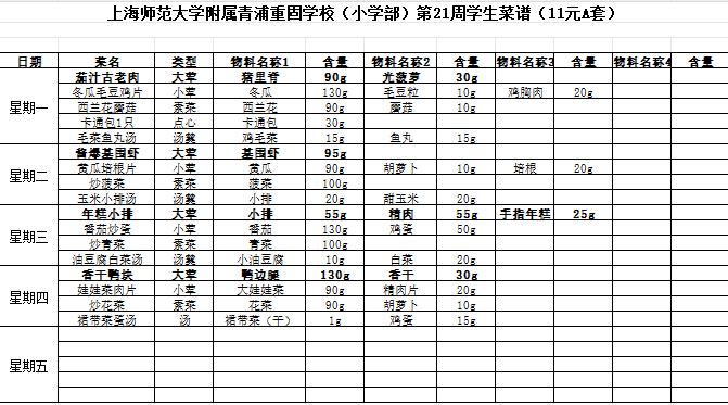 上海师范大学附属青浦重固学校(小学部)第21周学生菜谱